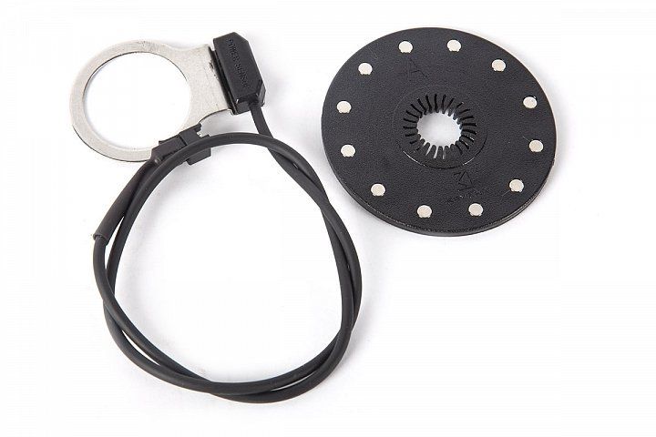 На каретку устанавливается датчик вращения педалей - он необходим для активации режима помощника, который активирует электромотор при вращении педалей. Усилия помощи электромотора при педалировании регулируются путём выставления уровня PAS (ассистента) на управляющем велокомпьютере.