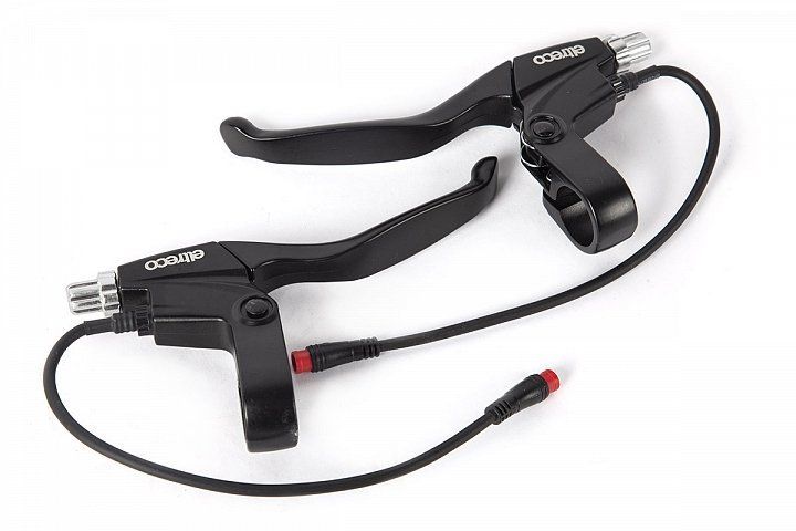 Две ручки тормоза, идущие в комплекте, снабжены концевиками, которые отключают электромотор при торможении.