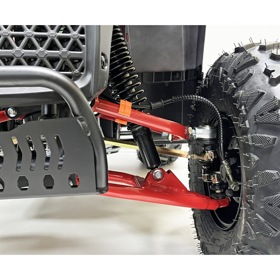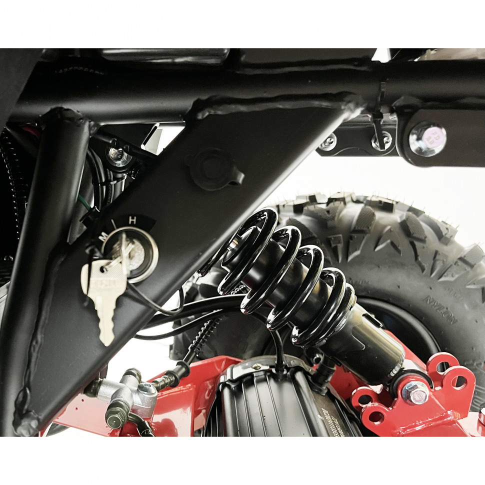 Шасси квадроцикла оснащено пружинными амортизаторами, которые обеспечивают комфортную езду по неровным поверхностям. Дисковые гидравлические тормоза как спереди, так и сзади гарантируют надежное торможение, что повышает безопасность во время поездок.