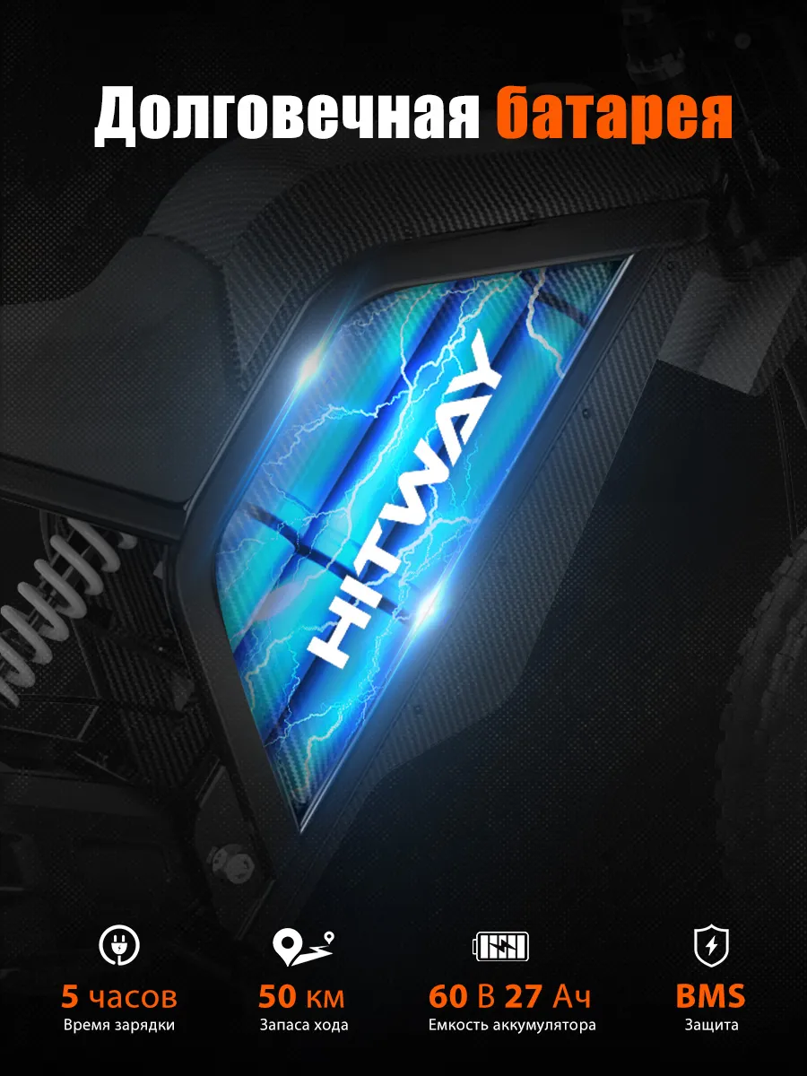 Литий-ионная аккумуляторная батарея емкостью 27000 мА·ч и напряжением 60 В обеспечивает запас хода до 50 км на одном заряде. Этого пробега достаточно для активных выездов на природу и длительных прогулок. Время полной зарядки составляет 5 часов.