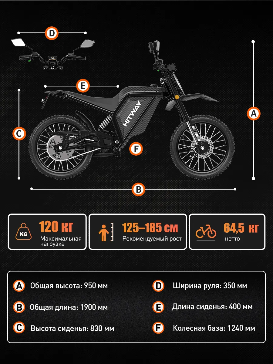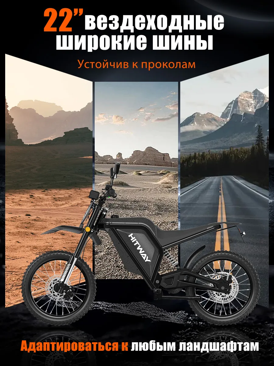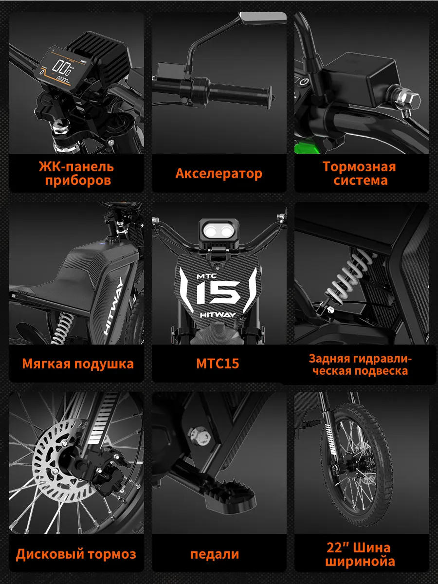 Электропитбайк HITWAY MTC15 создан для активной езды по пересеченной местности, сочетая мощный электродвигатель с усиленной ходовой частью. Колеса диаметром 22 дюйма обеспечивают отличную проходимость и позволяют уверенно преодолевать препятствия на бездорожье. Угол подъема достигает 30 градусов, что дает возможность штурмовать крутые склоны без потери тяги.