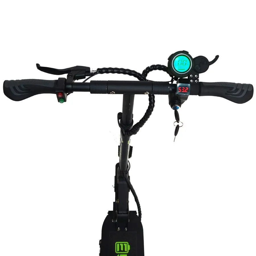 Дисковый механический задний тормоз вкупе с электрическим тормозом позволит эффективное торможение. Модель весит всего 19 кг, что немного для данного класса самокатов. Сбоку деки имеется устойчивая подножка для парковки. Электросамокат Electroway M2 оснащён складным механизмом, который делает его компактным для хранения в небольшой квартире или в багажнике автомобиля. Складывается так же и руль. Для езды в темное время суток спереди располагается яркая фара, сзади стоп-сигнал, а по бокам поворотники. Всё это поможет лучше контролировать ситуацию на дороге. На руле располагаются управление подсветкой, гудок, бортовой компьютер.