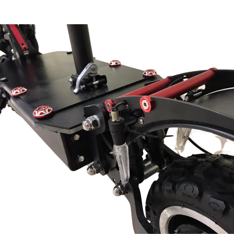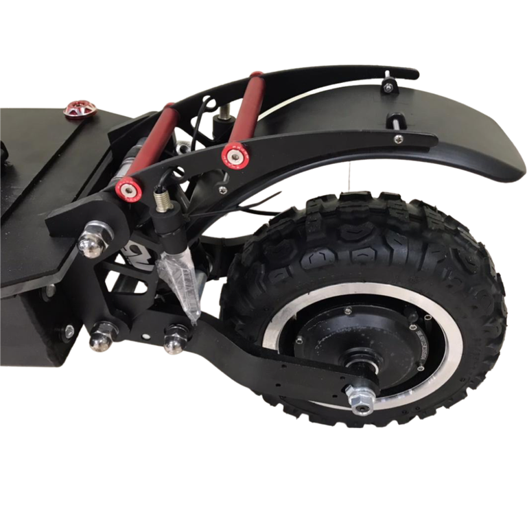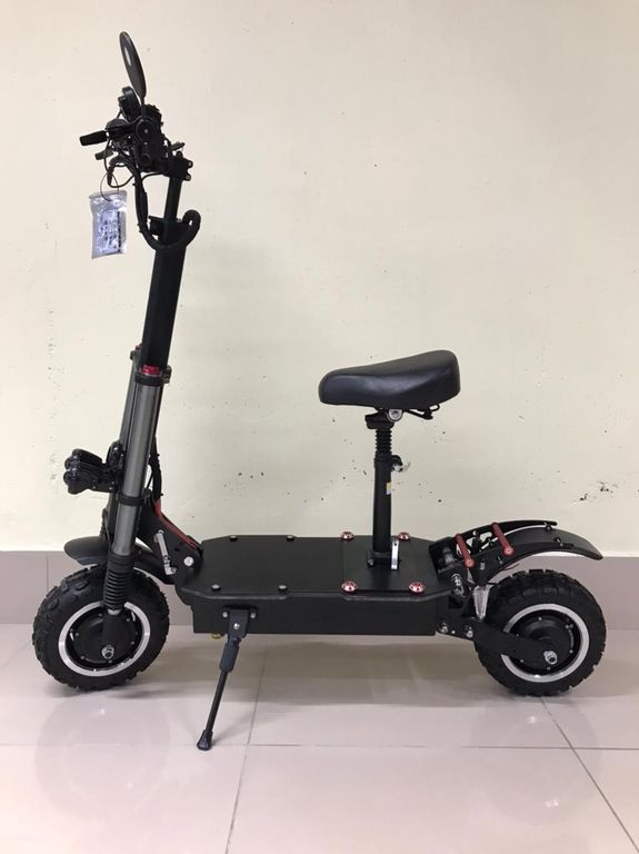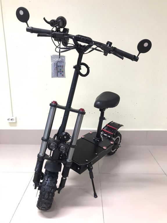 - В каждом его колесе установлен двигатель 3000Вт, благодаря чему на полном приводе электросамокат способен разогнаться до 85 км/ч. Райдер может в любой момент одним нажатием кнопки отключить переднее мотор-колесо для экономии энергии. Даже при езде на заднем приводе этот самокат набирает скорость до 65-70км/ч.