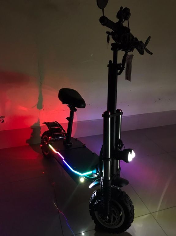 - Для комфорта и безопасности райдера в конструкции самоката предусмотрена широкая дека с наждачным покрытием, яркие фары и съемное сиденье.
