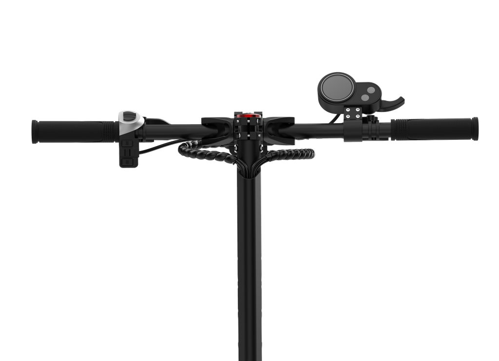 На руле расположены основные элементы управления в виде ручек газа/тормоза, вольтметра, а также информационного дисплея, на котором райдер может отслеживать скорость в реальном времени, пройденный путь и оставшийся заряд батареи.