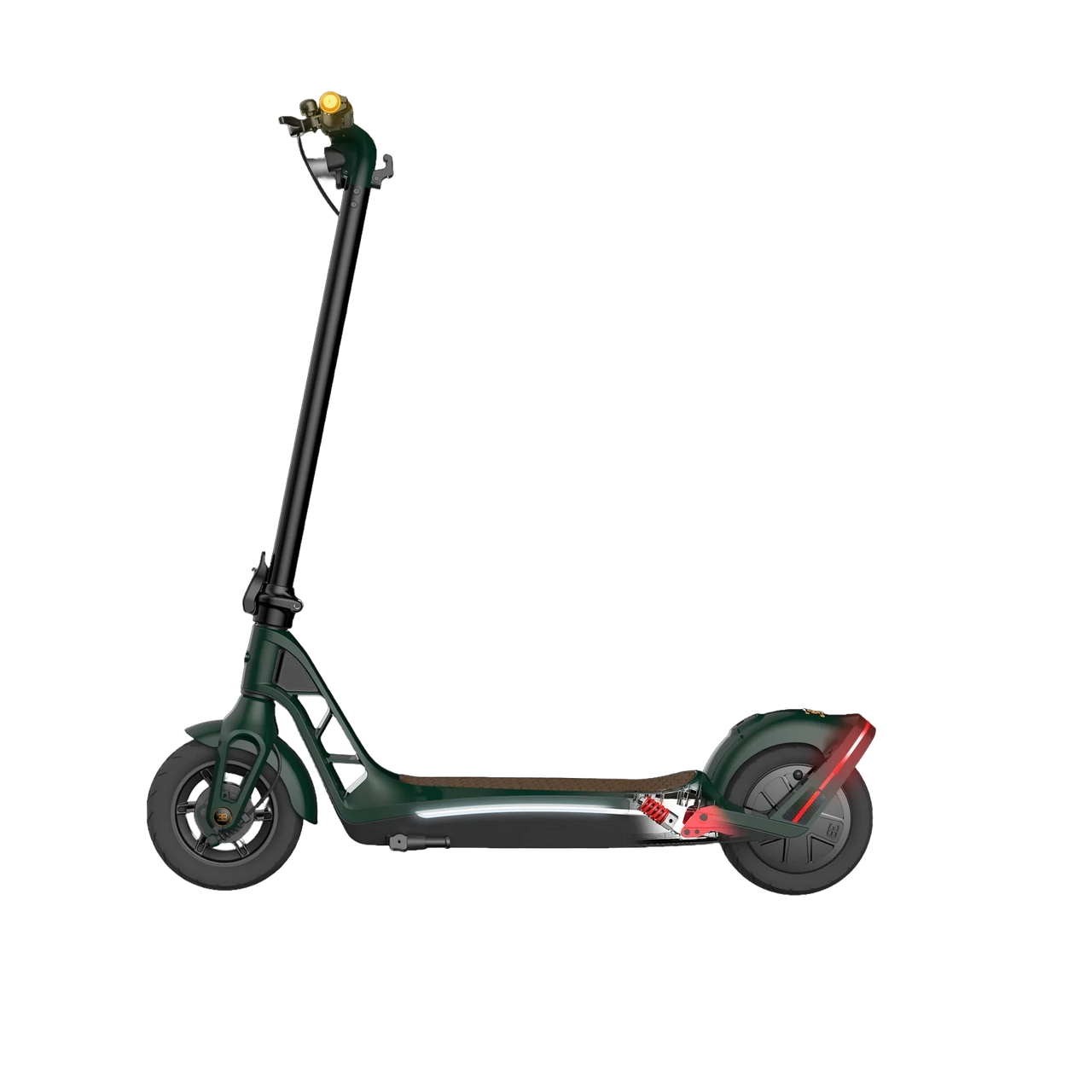 Колеса диаметром 10 дюймов с качественными покрышками обеспечивают отличную устойчивость и комфортное преодоление стыков асфальта и мелких выбоин. Задний привод гарантирует хорошее сцепление с дорожным покрытием и уверенное поведение при ускорении даже на мокром асфальте. Максимальный преодолеваемый угол наклона составляет 18 градусов, позволяя без труда подниматься на мосты и эстакады.
