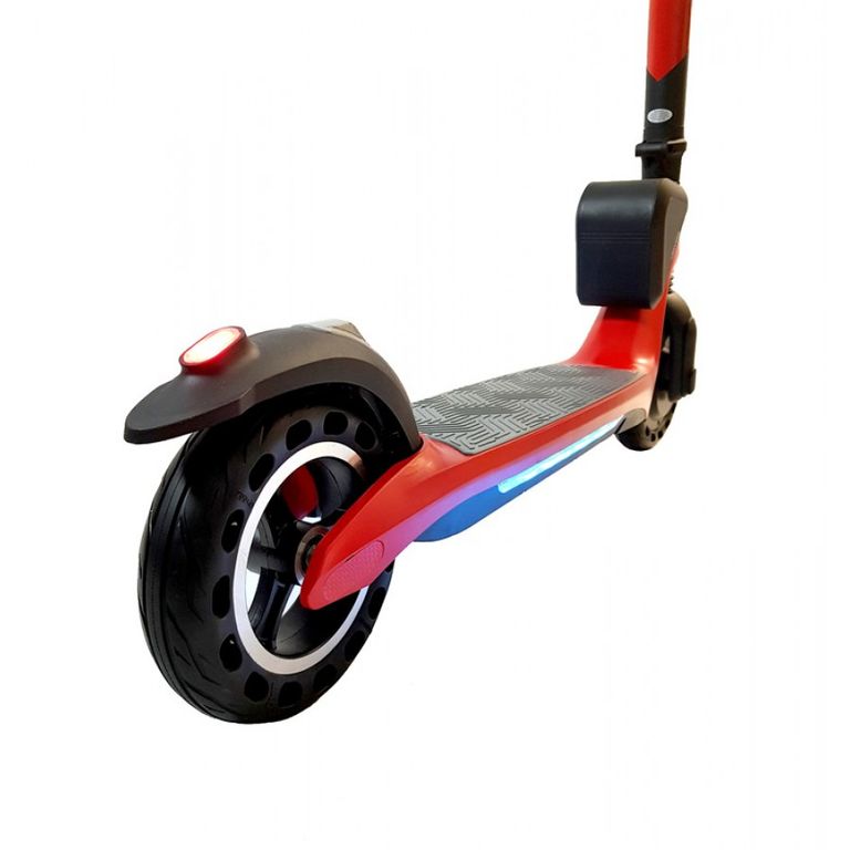 - Для безопасного вождения при плохом освещении самокат снабжен LED фонарем на рулевой стойке, задним стоп-сигналом и регулируемой цветной подсветкой по нижнему краю деки.