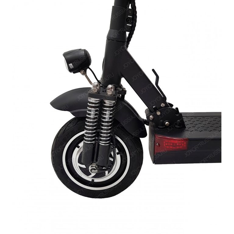 - Электрический складной самокат Joyor Y10S имеет передний и задний дисковый тормоз, а так же усовершенствованную двойную переднюю подвеску.