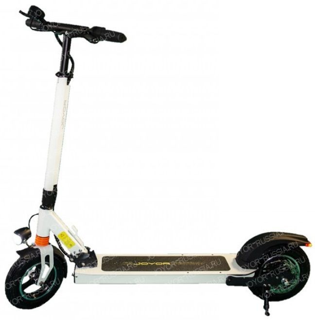 - Электросамокат Joyor Y1 с большими 10-дюймовыми пневматическими (надувными) колесами, имеющими отличные амортизирующие и противоскользящие протекторы, в сочетании с бесщеточным электродвигателем постоянного тока мощностью 400 Вт, обеспечивает более плавную езду.