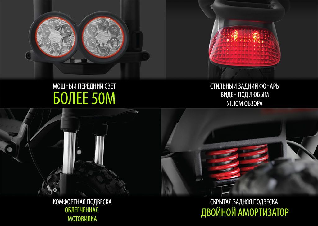 - В темное время суток дорогу подсвечивают мощные передние фонари, с диапазоном до 50м, а сзади WOLF WARRIOR подсвечивается габаритом и стоп сигналом.