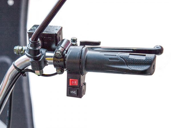 Управление скоростью осуществляется с помощью ручки газа, что обеспечивает простоту в эксплуатации. Тормозная система включает дисковые тормоза спереди и барабанные сзади, что гарантирует надежное торможение в любых условиях.