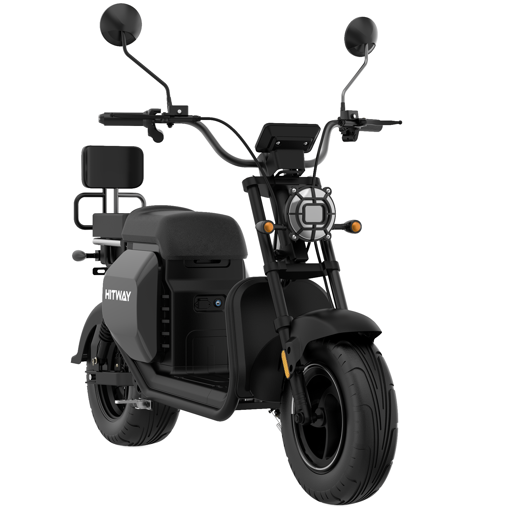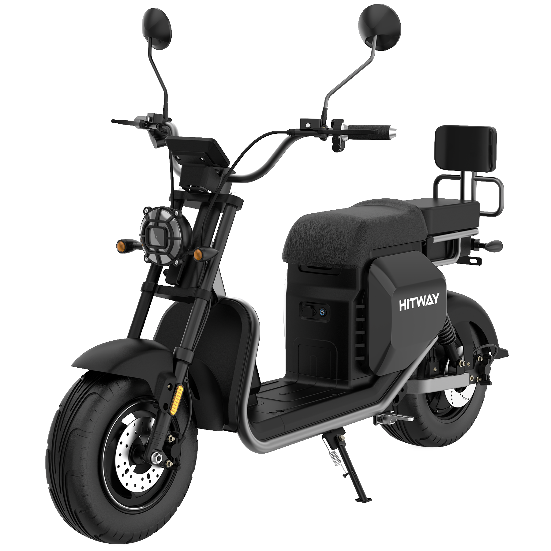Яркая передняя фара и задний фонарь делают вас заметным на дороге в любое время суток, а многофункциональная LCD-панель приборов отображает всю необходимую информацию: скорость, уровень заряда аккумулятора, пробег и выбранный режим езды. Удобное сиденье, боковая подножка и дроссельная ручка обеспечивают максимальный комфорт и удобство управления электроскутером Hitway HL-2.