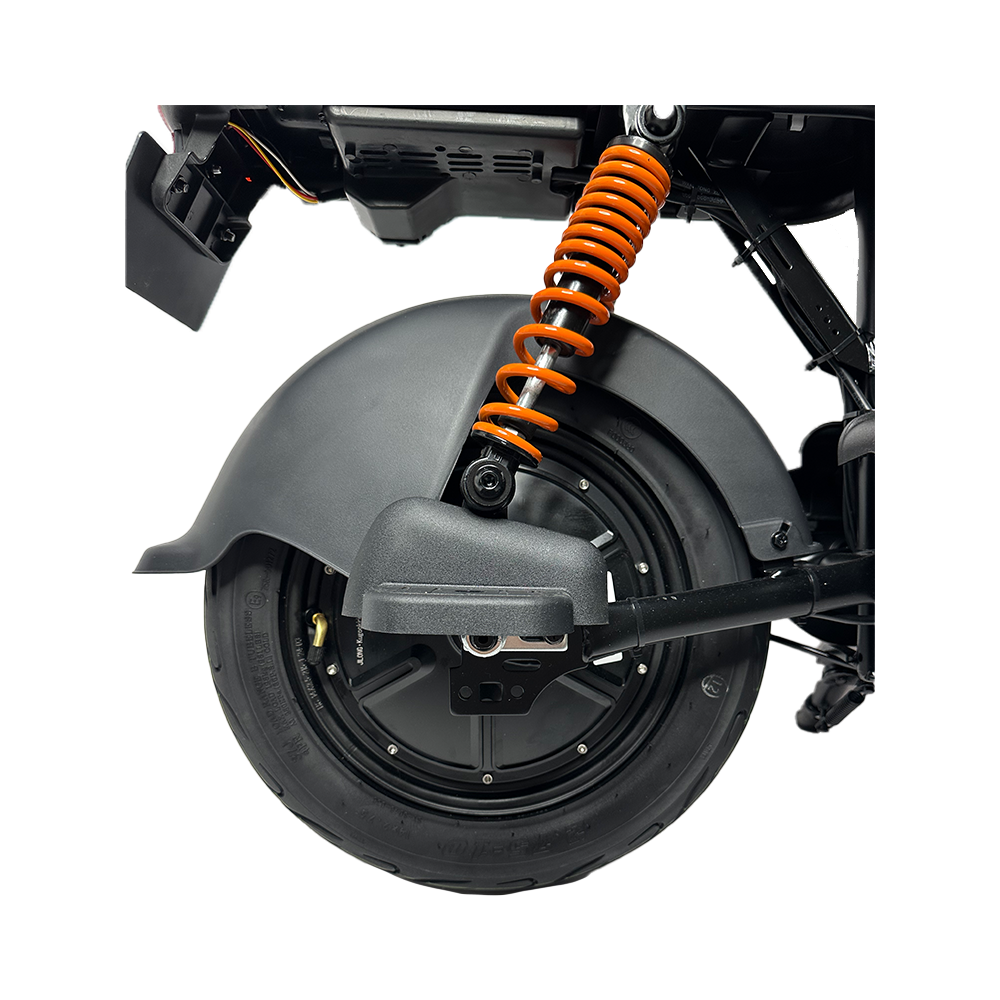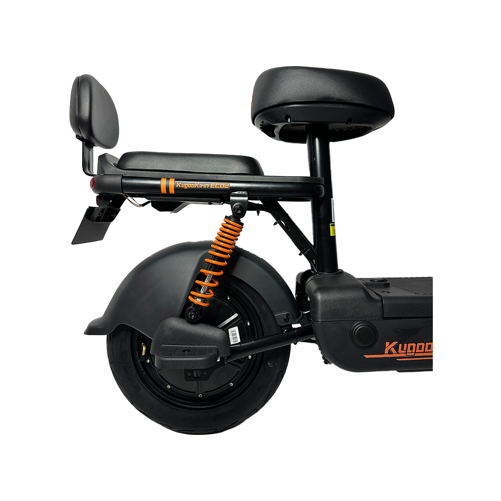 Kugoo Kirin EC 02 оснащен 12-дюймовыми надувными колесами, которые обеспечивают отличную проходимость и комфорт на разных типах дорожных покрытий. Задний привод гарантирует стабильность и управляемость, что особенно важно при движении по городским улицам.