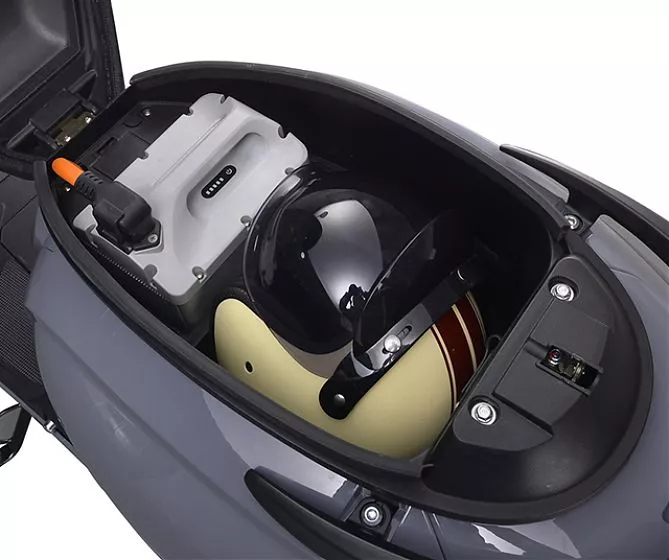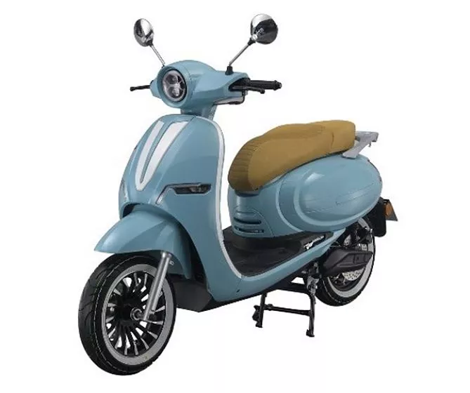 LG PLUS - это стильный электроскутер, выполненный в ретро-стиле и небесно-голубом цвете. Его изящный дизайн и бежевое седло делают его очень привлекательным. Винтажный образ дополнен современными технологиями, такими как цветной дисплей и светодиодные фары. Максимальная скорость скутера составляет 80 км/ч, а запас хода - до 130 км (с двумя аккумуляторами, второй аккумулятор приобретается отдельно). Вы можете выбирать между тремя режимами движения с помощью переключателя. Также есть режим заднего хода для большего комфорта при маневрировании. Скутер оснащен передним и задним LED-освещением, боковыми зеркалами и системой CBS для безопасности.