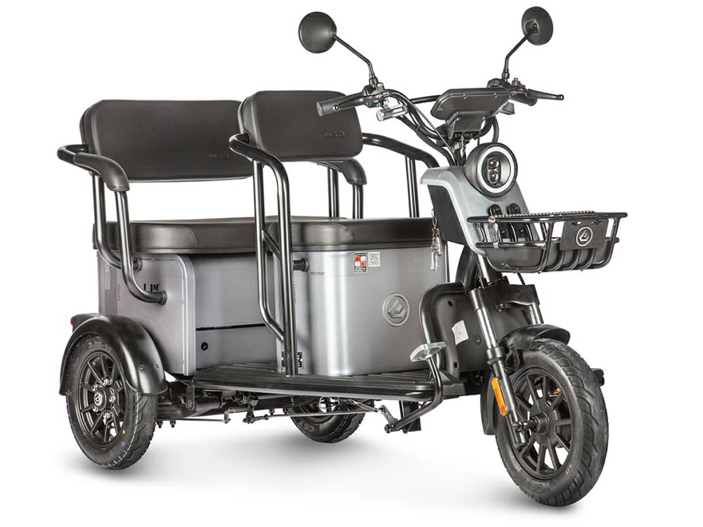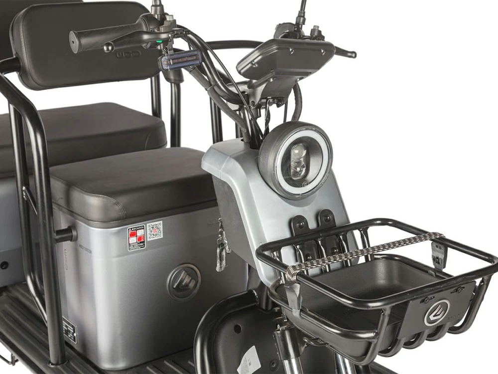 Отсутствие крыши и тента придает модели легкость, а освещение спереди и сзади обеспечивает безопасность в темное время суток. Этот трицикл станет отличным выбором для покупок, поездок на дачу или просто для комфортных поездок по городу.