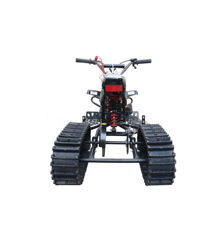 - На данном снегоцикле сзади установлен гусеничный модуль, спереди установлены широкие лыжи из прочного пластика с металлическим усилителем в основании.