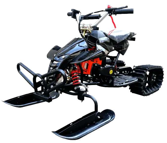 - Детский снегоцикл оборудован компактным двухтактным бензиновым двигателем с увеличенным рабочим объёмом 62 куб. см., в паре с фрикционным сцеплением центробежного типа. Это обуславливает простоту и надежность конструкции данной модели.