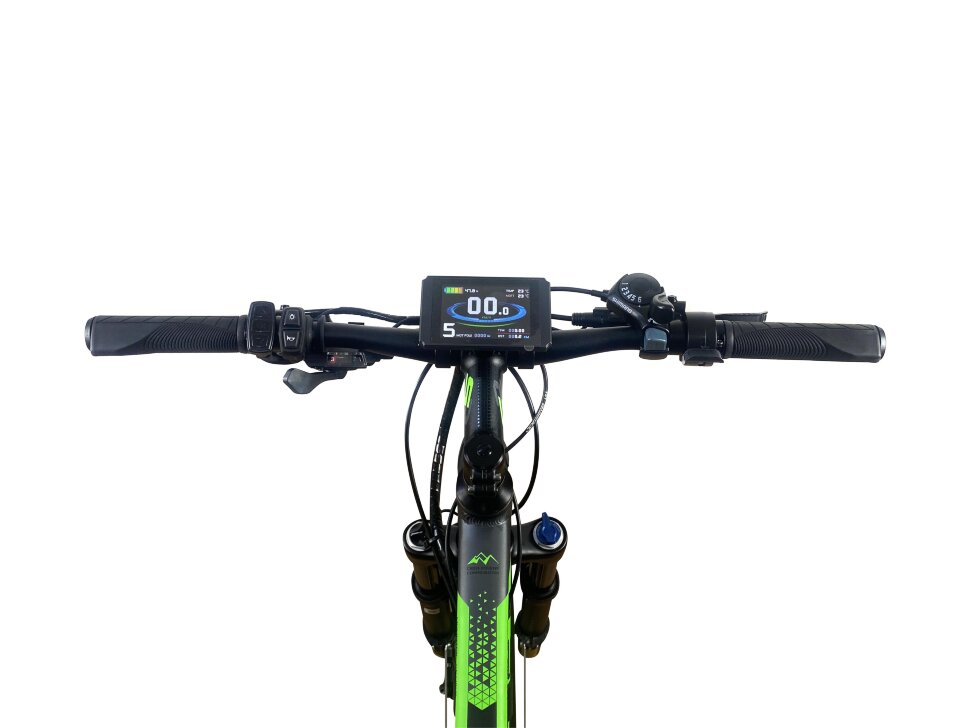 Электровелосипед оборудован колесами размером 27.5 х 2.8 дюйма, что обеспечивает отличную проходимость и устойчивость на различных типах местности. Широкие шины способствуют лучшему сцеплению с дорогой, что особенно важно при движении по сложным маршрутам.