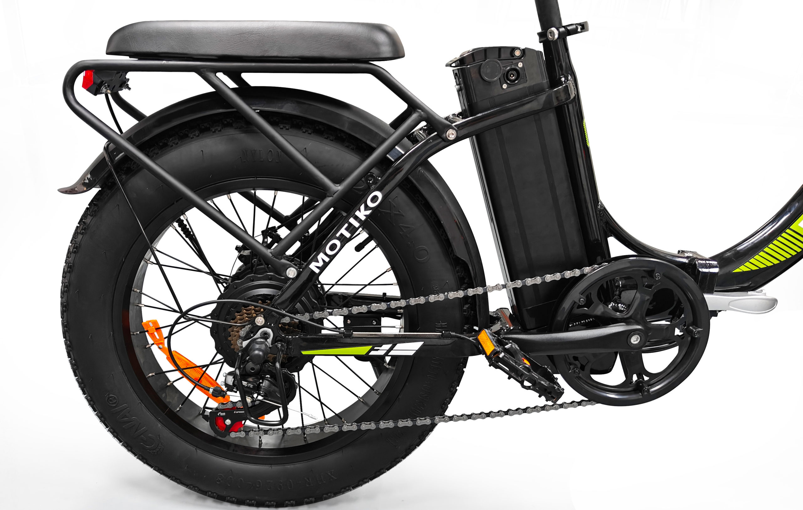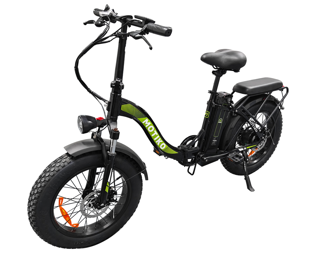 Электровелосипед MOTIKO MF1 построен на 20-дюймовой раме из алюминиевого сплава черного цвета, которая обеспечивает легкость конструкции и устойчивость к коррозии. Алюминий позволяет снизить общий вес велосипеда без потери жесткости, необходимой для активного маневрирования на пересеченной местности. Внедорожные шины H-5176 размером 20×4.0 дюйма относятся к классу fatbike и гарантируют уверенное передвижение по песку, снегу, грязи и другим сложным поверхностям.