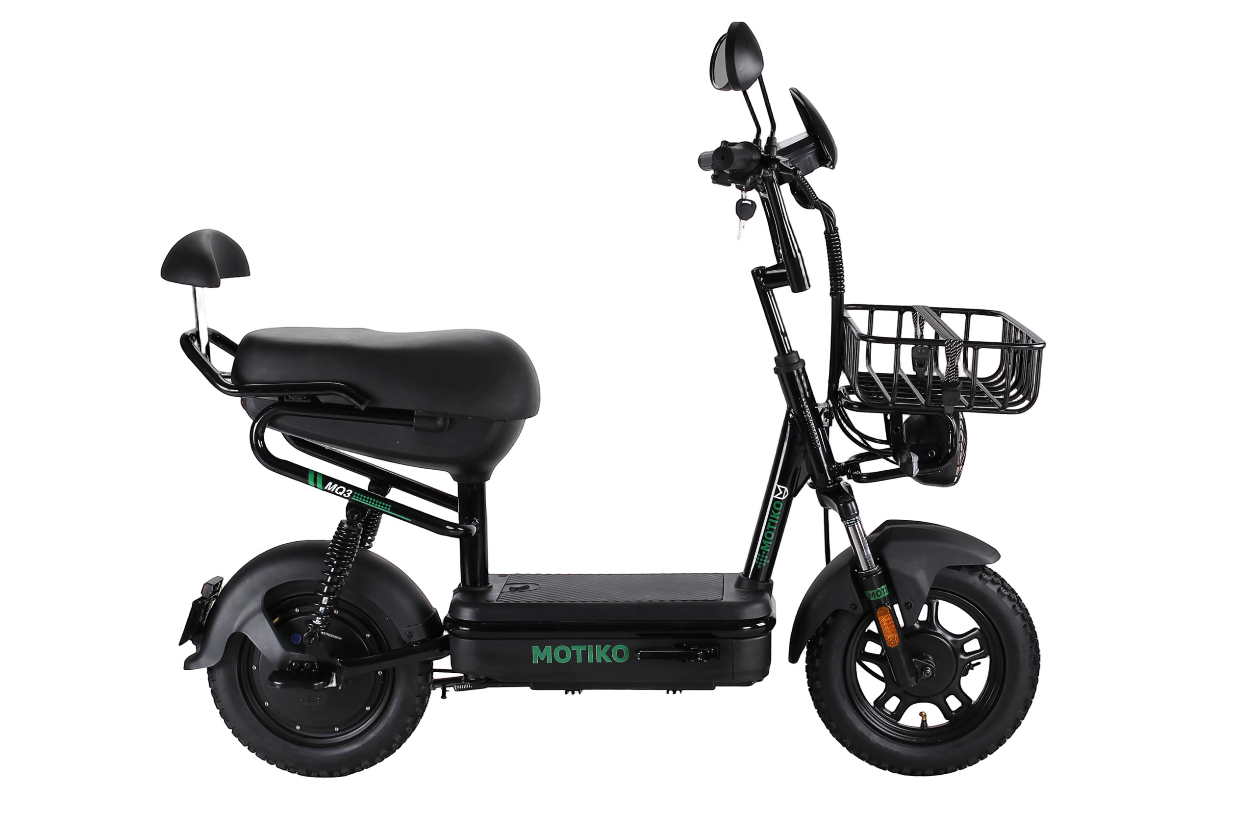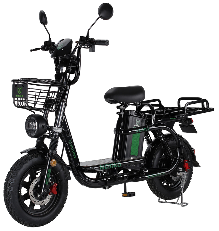 Электровелосипед MOTIKO MQ3 выполнен на 14-дюймовых колесах в черно-зеленой цветовой гамме, сочетающей стильный внешний вид с практичностью для городских условий. Небольшой размер рамы обеспечивает отличную маневренность в плотном потоке и удобство хранения в малогабаритных помещениях. Максимальная нагрузка составляет 120 кг, что позволяет комфортно использовать велосипед большинству водителей.