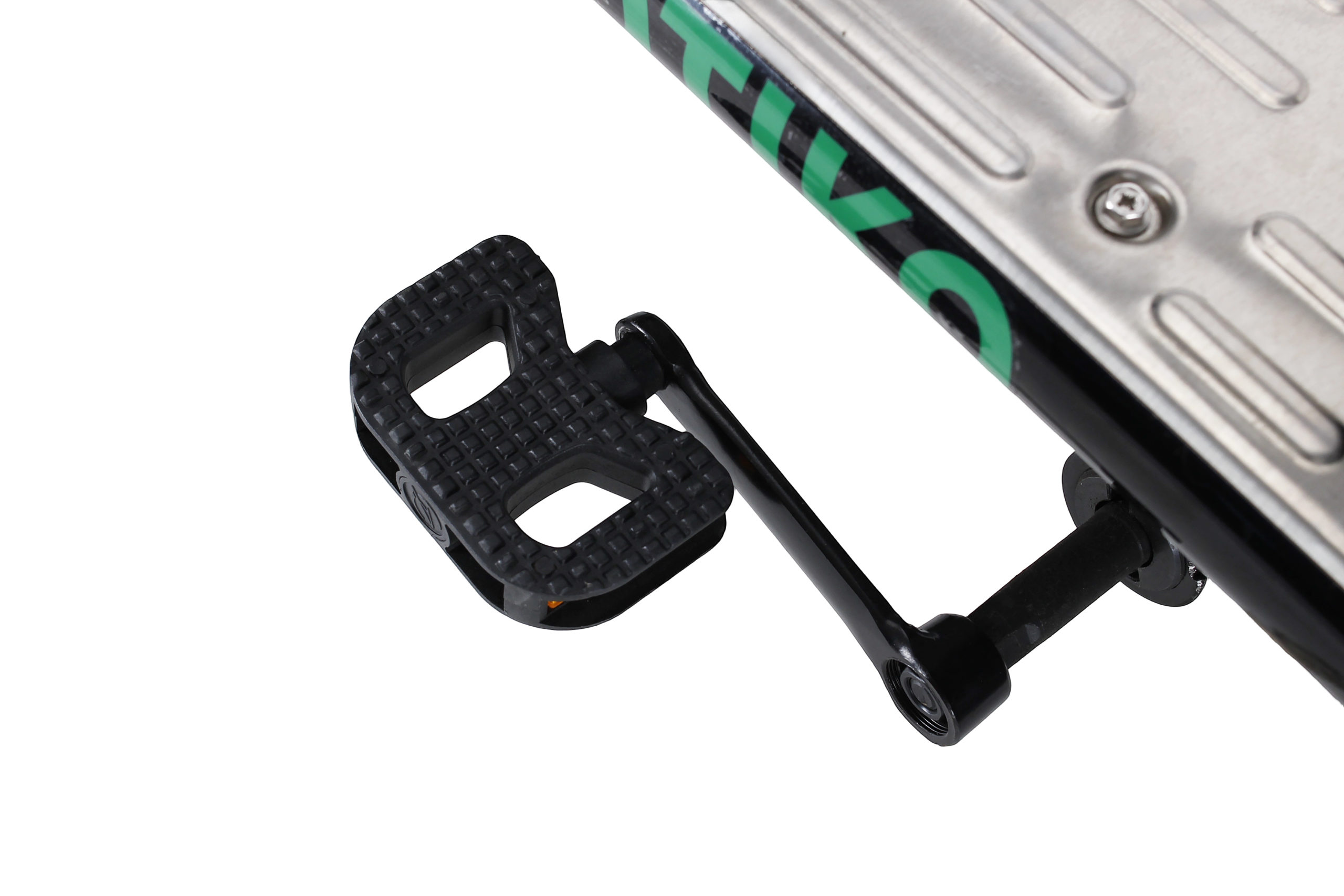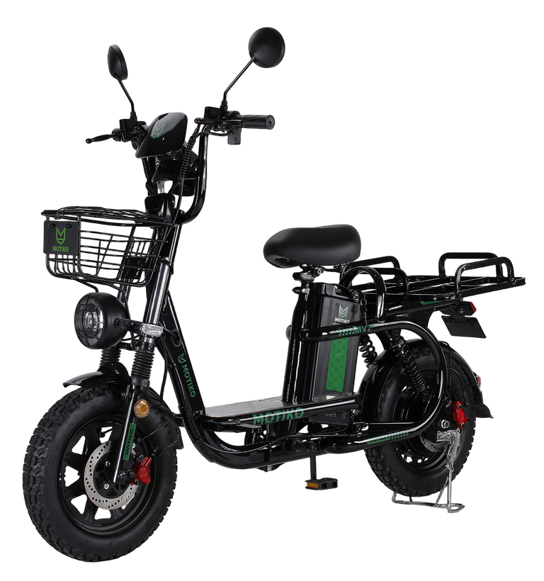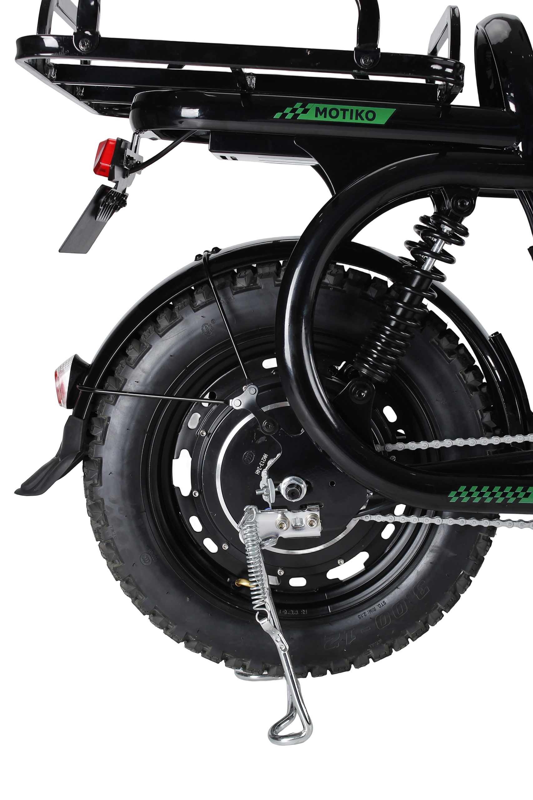 Электровелосипед MOTIKO MV7 выполнен в стильной черно-зеленой цветовой гамме с колесами диаметром 16 дюймов. Всесезонные брендовые покрышки размером 16×3.0 дюйма обеспечивают уверенное сцепление с дорогой как в сухую, так и в дождливую погоду, а увеличенная ширина профиля повышает устойчивость при маневрировании. Передняя и задняя амортизация работают в паре, эффективно гася вибрации и удары от неровностей дорожного покрытия.
