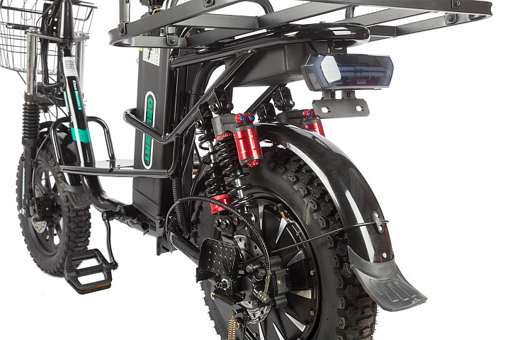 Электровелосипед имеет габариты 1700 х 1150 х 800 мм и выполнен из прочной стальной рамы, что обеспечивает долговечность конструкции. Сухой вес составляет 57 кг, что делает его достаточно устойчивым и удобным для транспортировки.