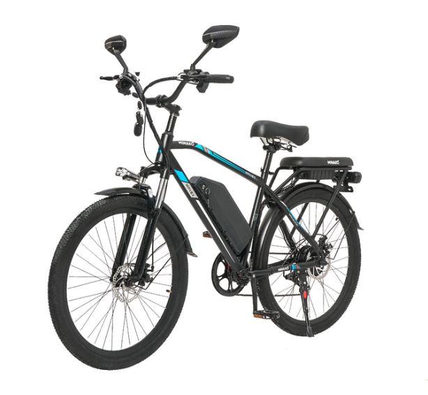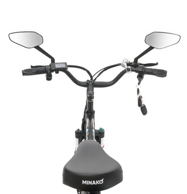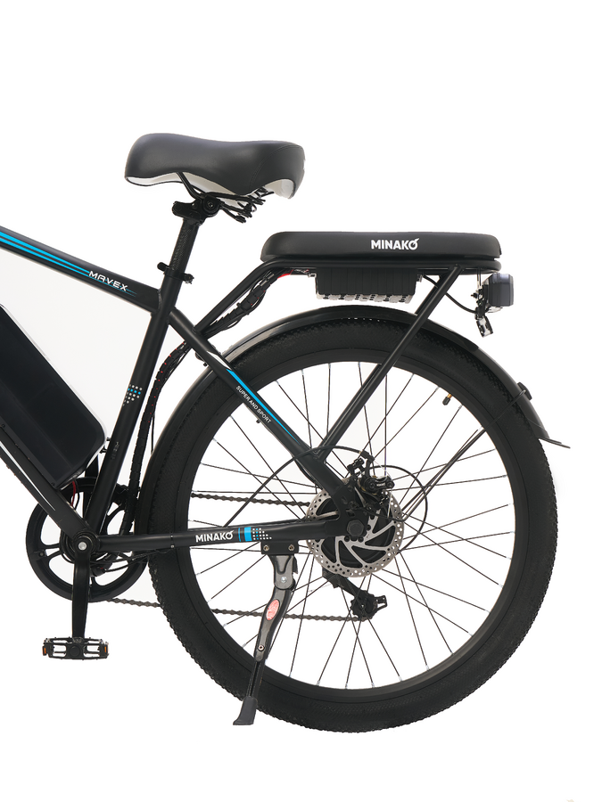 Электровелосипед Minako Mavex также оснащен сигнализацией, что повышает уровень безопасности при стоянке. Мягкий багажник позволяет удобно размещать личные вещи, а задние поворотники обеспечивают дополнительную видимость на дороге, особенно в темное время суток.