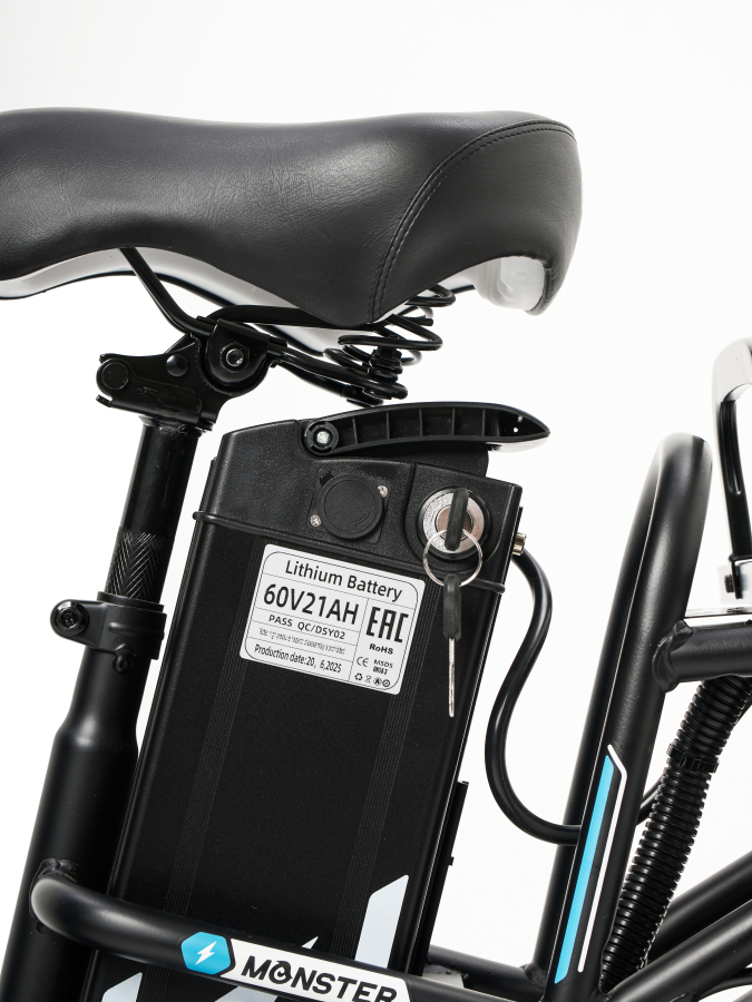 Электровелосипед Minako Monster PRO работает на батарее 60V 21Ah, что гарантирует высокую эффективность и стабильную работу. Полная зарядка от стандартного зарядного устройства на 3А занимает всего 7 часов, что позволяет быстро готовиться к новым поездкам. Максимальная нагрузка в 150 кг делает его универсальным для разных пользователей, обеспечивая комфорт даже при полной загрузке.
