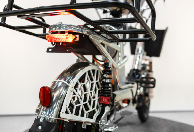Тормозная система включает передний барабанный и задний дисковый тормоза, обеспечивая безопасное и надежное торможение. Литые колеса обеспечивают дополнительную устойчивость и снижают риск проколов, что делает каждую поездку более безопасной и приятной.