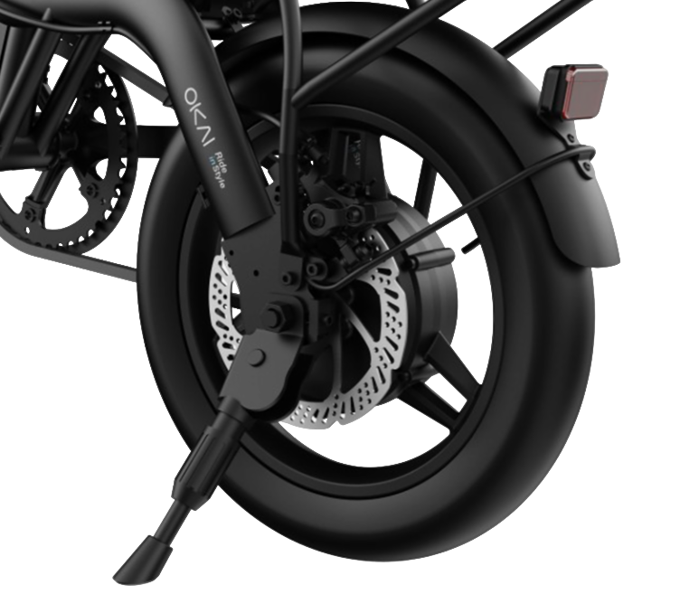 Электровелосипед OKAI EBF20 оснащен рамой из алюминиевого сплава, которая обеспечивает легкость конструкции и устойчивость к коррозийным процессам. Алюминий позволяет снизить общий вес велосипеда без потери прочностных характеристик, что особенно важно для компактной модели, предназначенной для частого использования в городе. Масса устройства составляет 25 кг, что делает его удобным для подъема по лестнице и транспортировки.